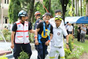 สำหรับในช่วงบ่าย เป็นกิจกรรม "ภาคปฎิบัติตามสถานการณ์จำลอง การฝึกซ้อมแผนและฝึกซ้อมการอพยพหนีไฟจากอาคารสูง" เพื่อเตรียมความพร้อมรับเหตุที่อาจจะเกิดขึ้นจริง เช่น วิธีการเอาตัวรอดจากเหตุแผ่นดินไหว การใช้อุปกรณ์ดับเพลิง วิธีการดับเพลิง ตลอดจนสามารถระงับเหตุอัคคีภัยได้ในเบื้องต้น การช่วยเหลือผู้บาดเจ็บในอาคารสูง รวมทั้งการอพยพหนีไฟเมื่อเกิดเหตุไฟไหม้ เพื่อเป็นการลดการสูญเสียชีวิตและทรัพย์สิน