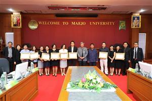 การประชุมคณะกรรมการบริหารมหาวิทยาลัย ครั้งที่ ๔/๒๕๖๐ เมื่อวันนที่ ๑๖ มิถุนายน ๒๕๖๐ ตั้งแต่เวลา ๐๙.๓๐ น. ณ ห้องประชุมสภามหาวิทยาลัย ชั้น ๕ อาคารสำนักงานอธิการบดี ในการนี้ ได้มีพิธีมอบใบประกาศแก่นักวิจัยของมหาวิทยาลัย โดยผศ.ดร.จำเนียร ยศราช อธิการบดีมหาวิทยาลัยแม่โจ้ ให้เกียรติมอบใบประกาศเกียรติคุณให้แก่คณะนักวิจัย ที่ได้รับรางวัลจาก