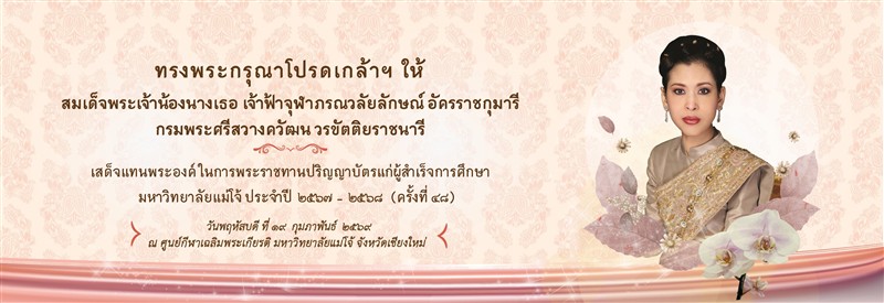 สมเด็จพระเจ้าน้องนางเธอ เจ้าฟ้าจุฬาภรณวลัยลักษณ์ อัครราชกุมารี กรมพระศรีสวางควัฒน วรขัตติยราชนารี เสด็จแทนพระองค์ไปในการพระราชทานปริญญาบัตรแก่ผู้สำเร็จการศึกษามหาวิทยาลัยแม่โจ้ ประจำปีการศึกษา 2567 - 2568 (ครั้งที่ 48)